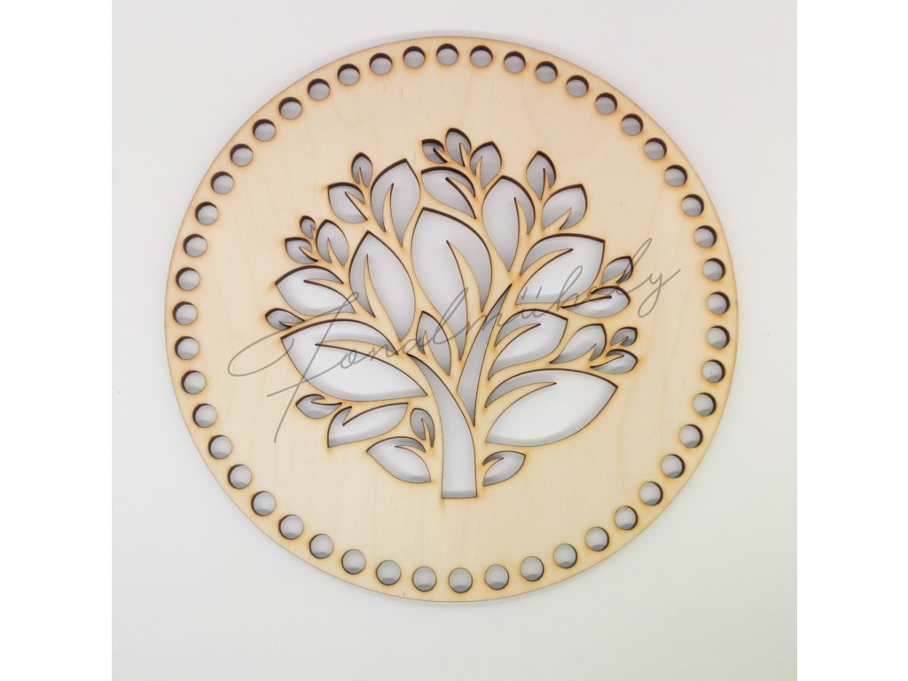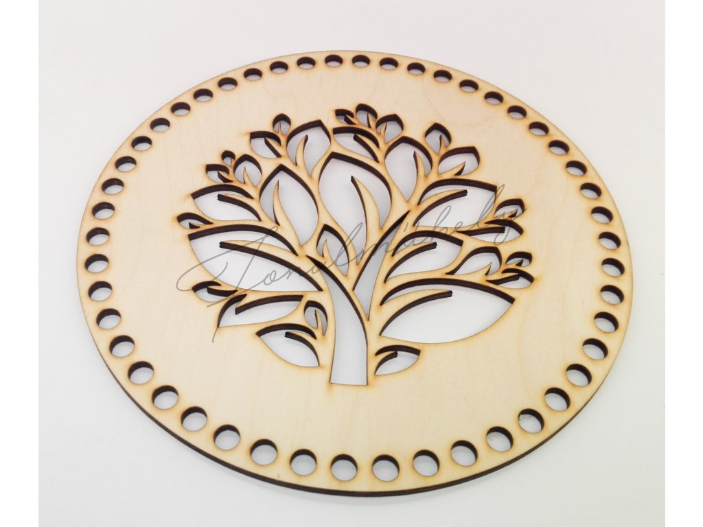 Horgolható, kör alakú alap, natúr fából, áttört fa mintával.