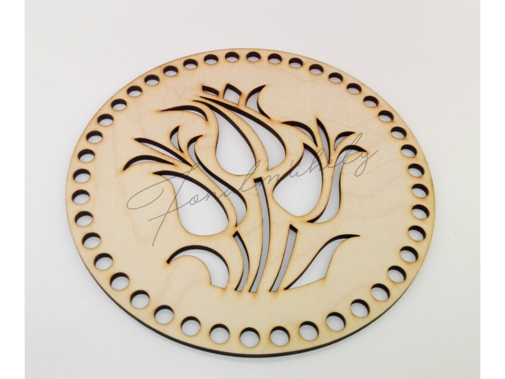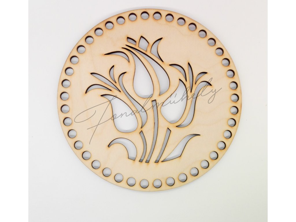 Horgolható, kör alakú alap, natúr fából, áttört tulipán mintával.
